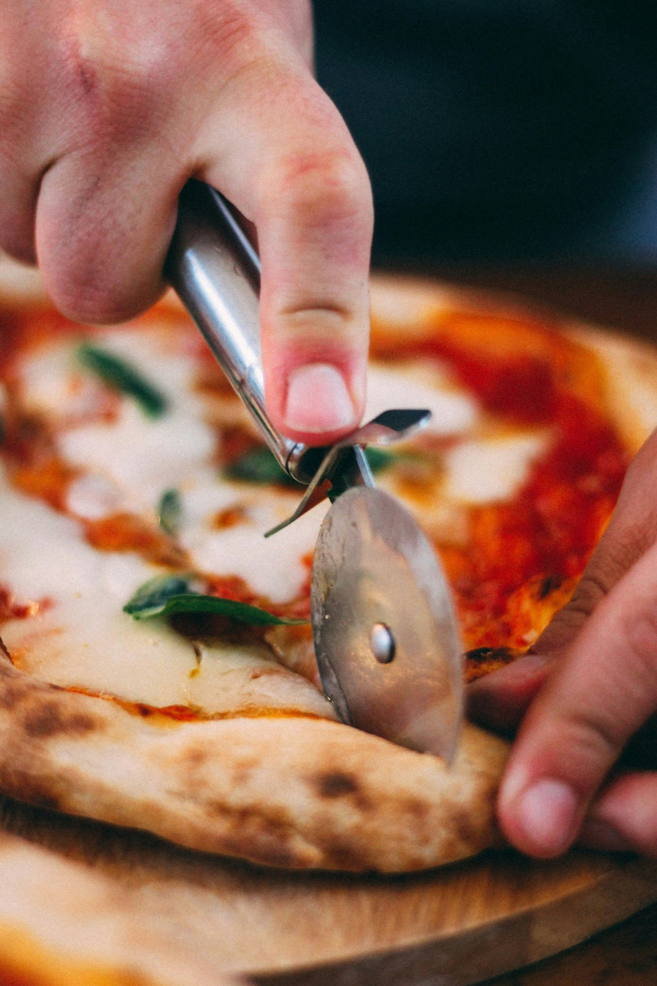 sos pomidorowy, ser mozzarella, ser mimolette, świeża bazylia po wypieku -