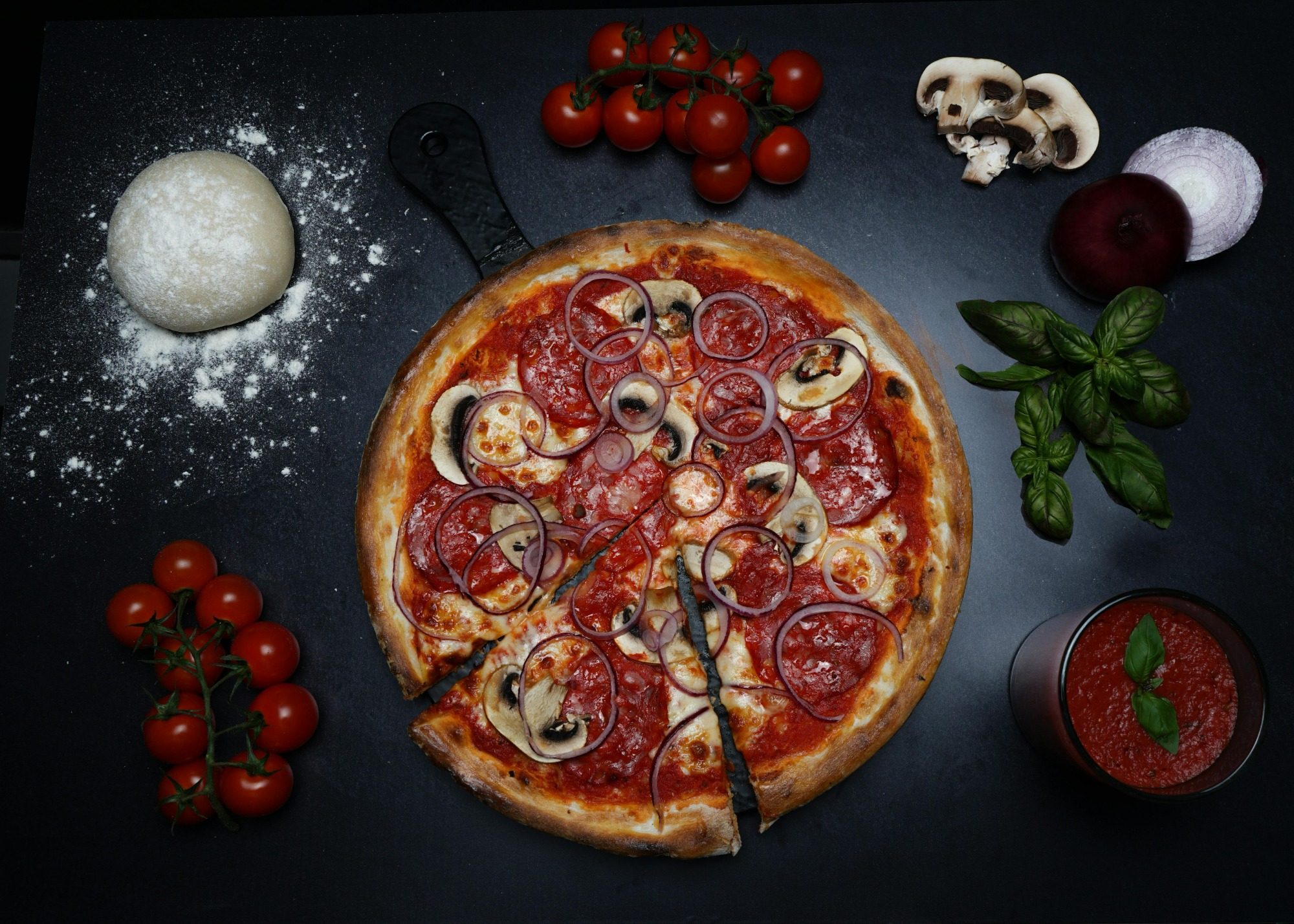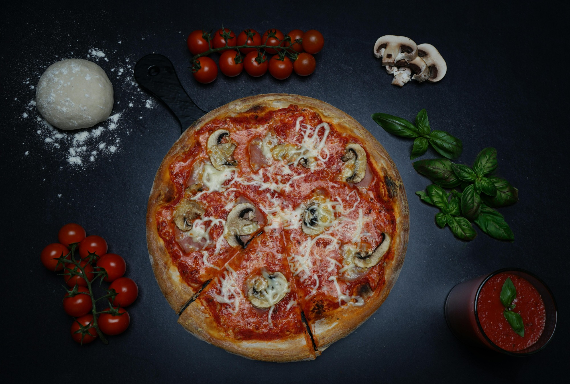 sos pomidorowy, ser mozzarella, ser mimolette, szynka, pieczarki, papryka, cebula, zielone oliwki -