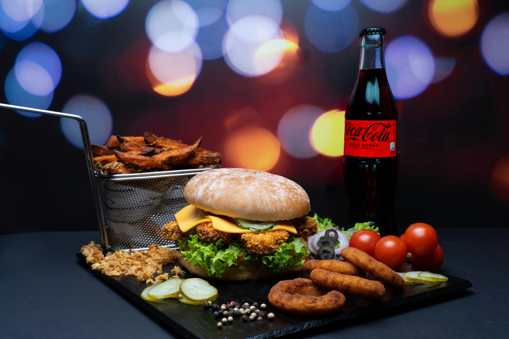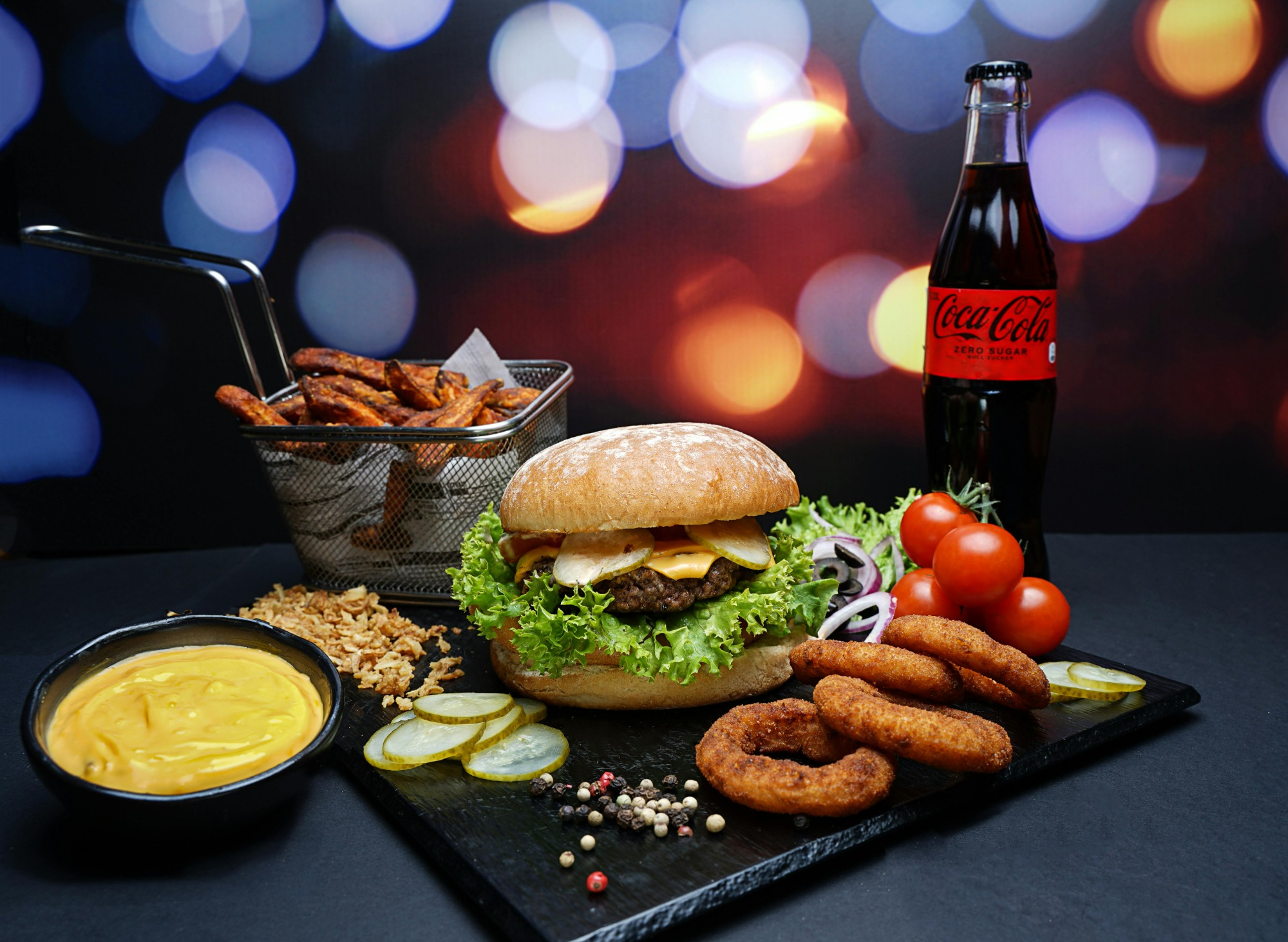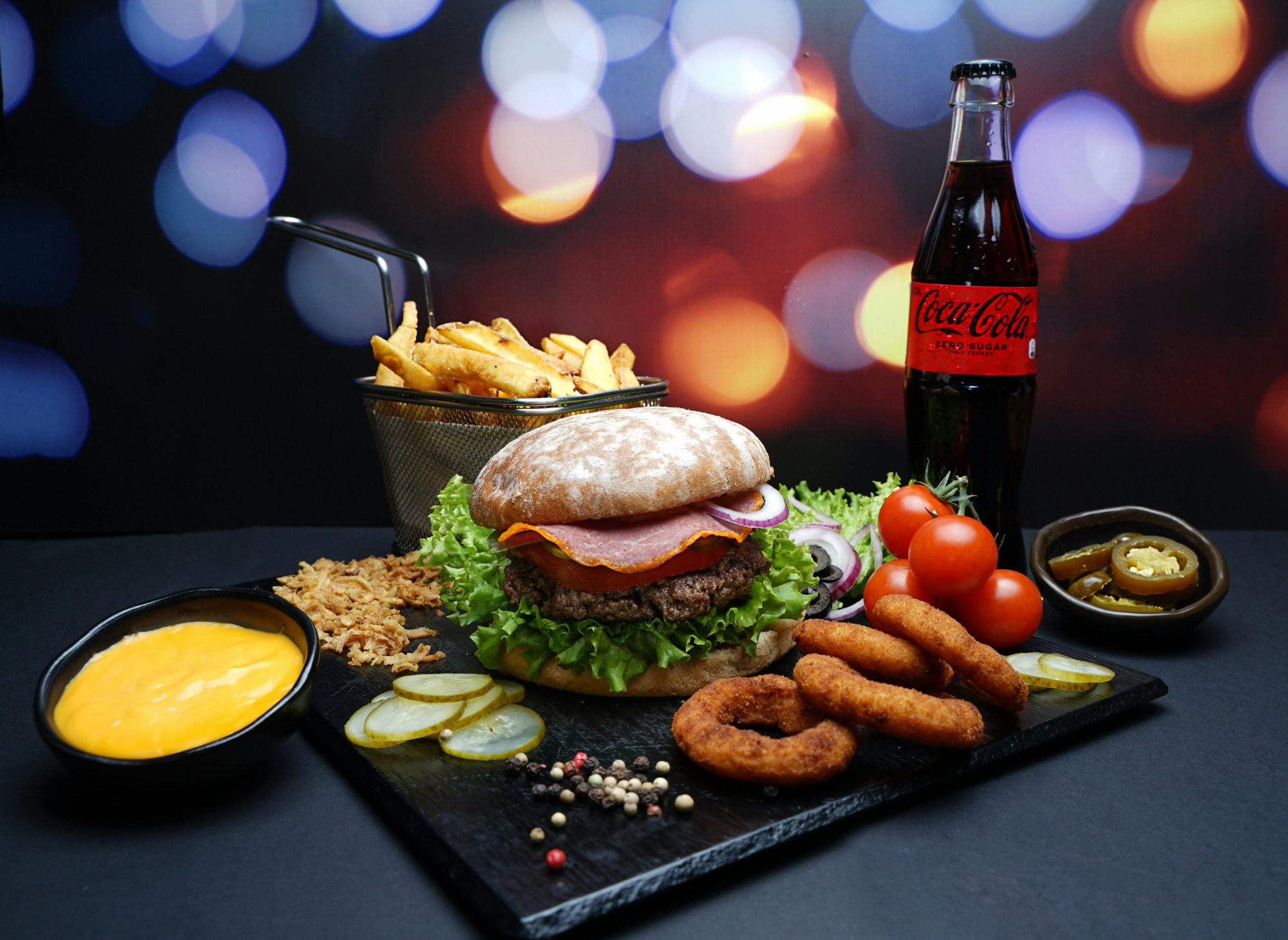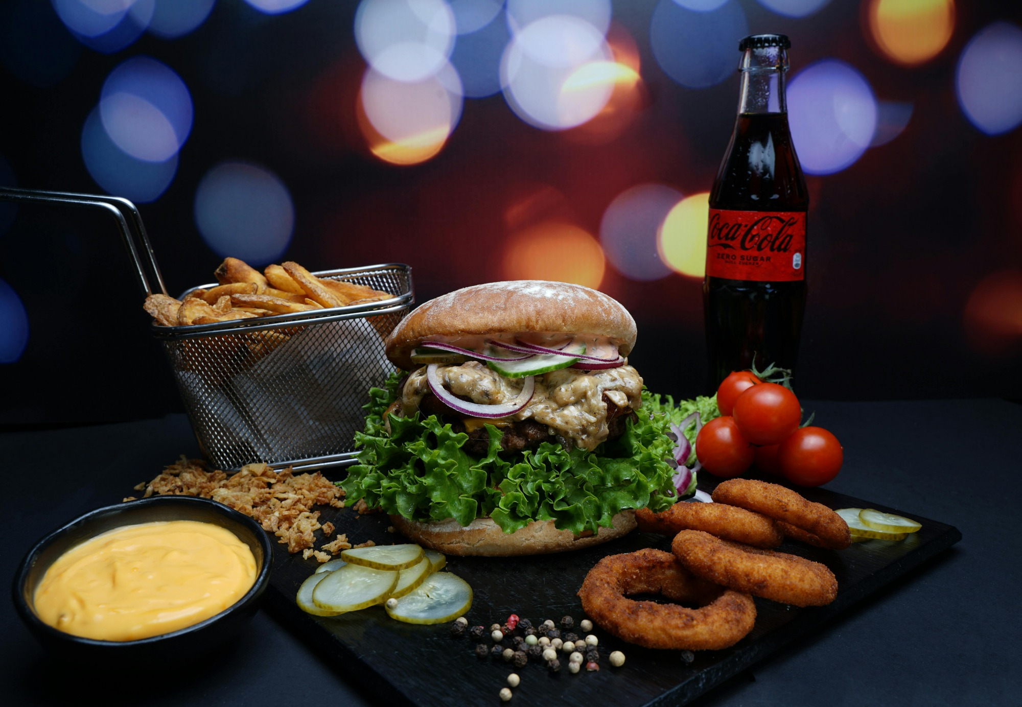 ogórek kiszony lub konserwowy, sos burgerowy, ser mozzarella, ser mimolette, mielona wołowina, czerwona cebula, prażona cebulka -