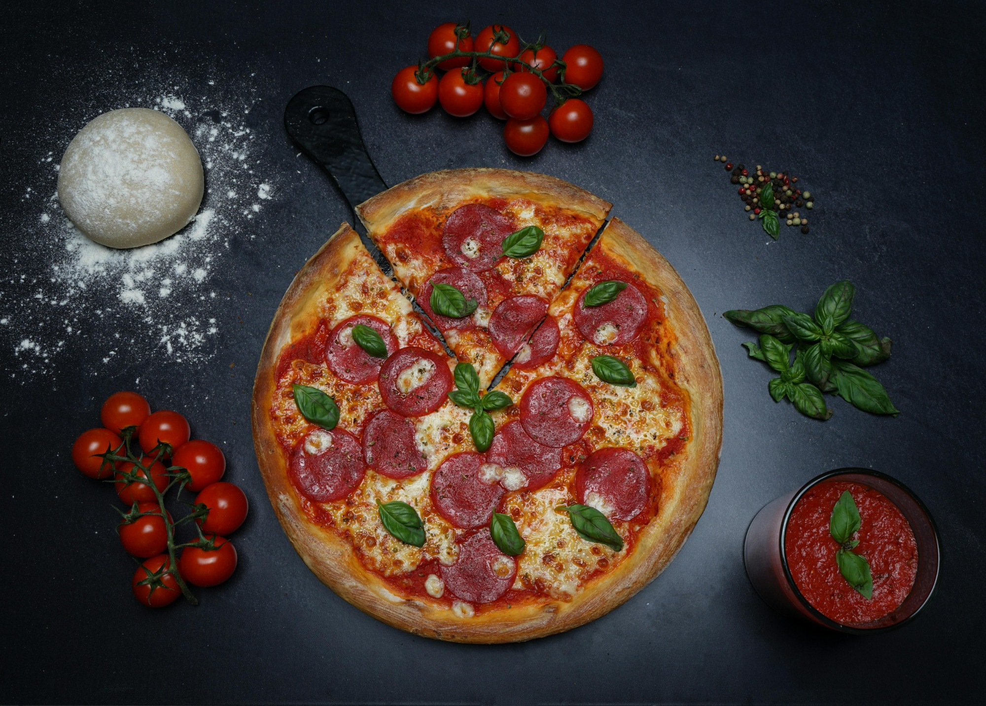 sos pomidorowy, ser mozzarella, ser mimolette, salami, świeże peperoni -